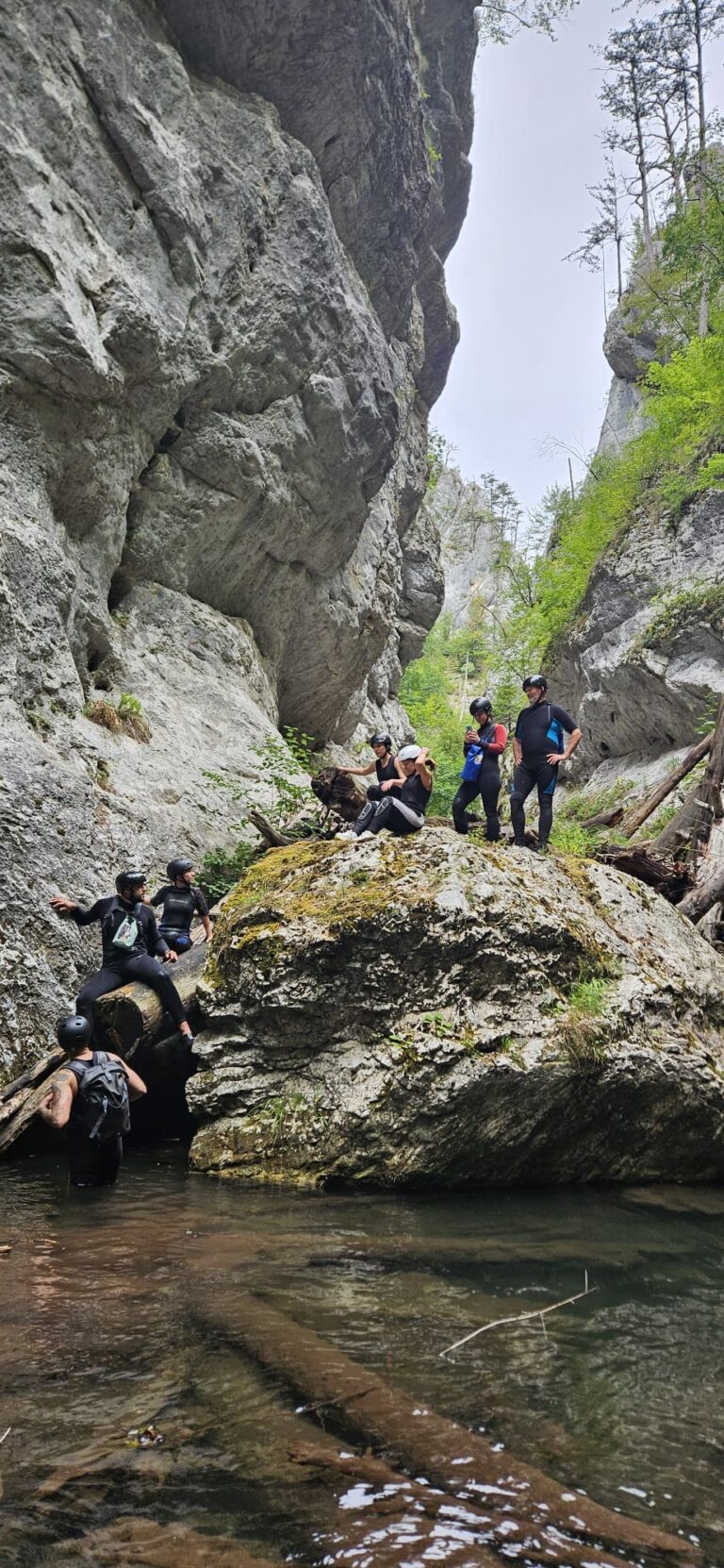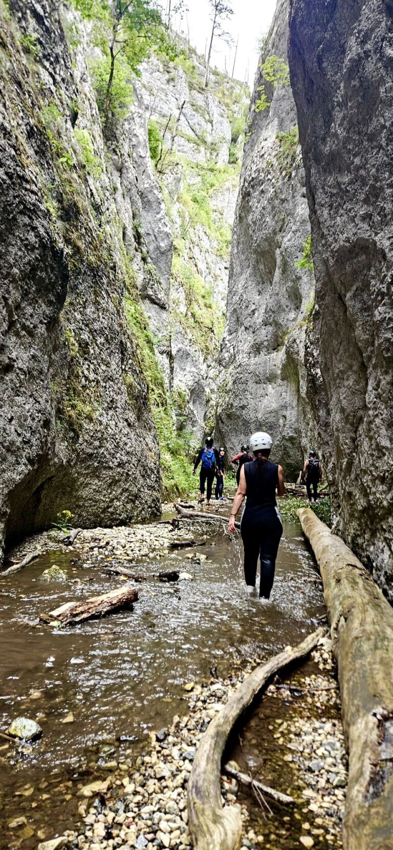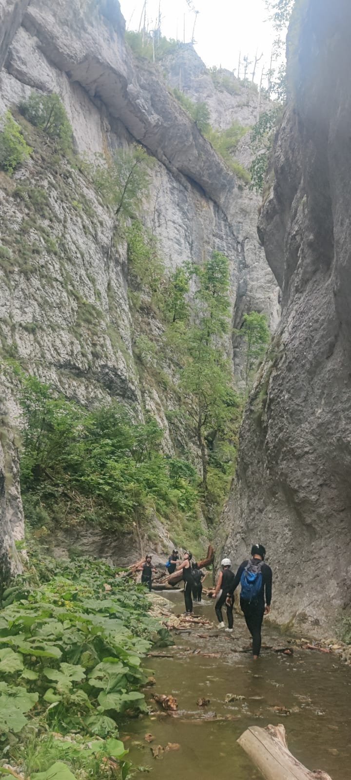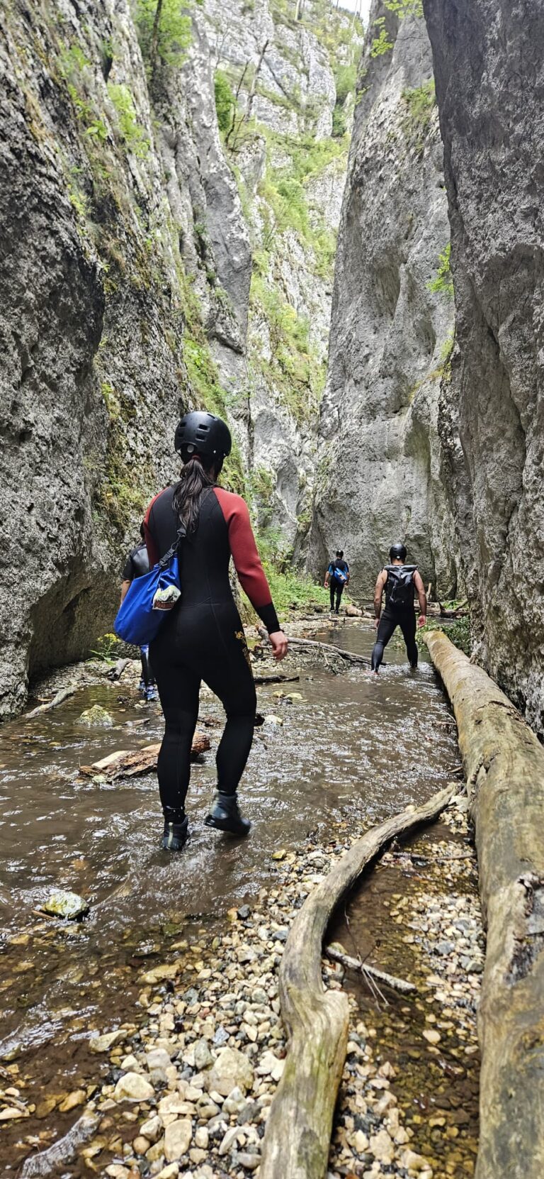 Nastavljamo niz kanjon,pažljivo prelazimo preko oborenih stabala, skačemo sa stene u krečnjački bazen udubljen u koritu kanjona. Na nekoliko mesta potrebno je preplivati duboku vodu sa svom opremom koju nosimo, a pre samog izlaska iz kanjona, na proširenom delu, odmaramo se na ugrejanim stenama obasjanim podnevnim Suncem i posle okrepljenja nastavljamo do izlaska iz kanjona.