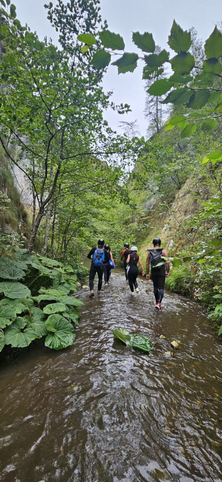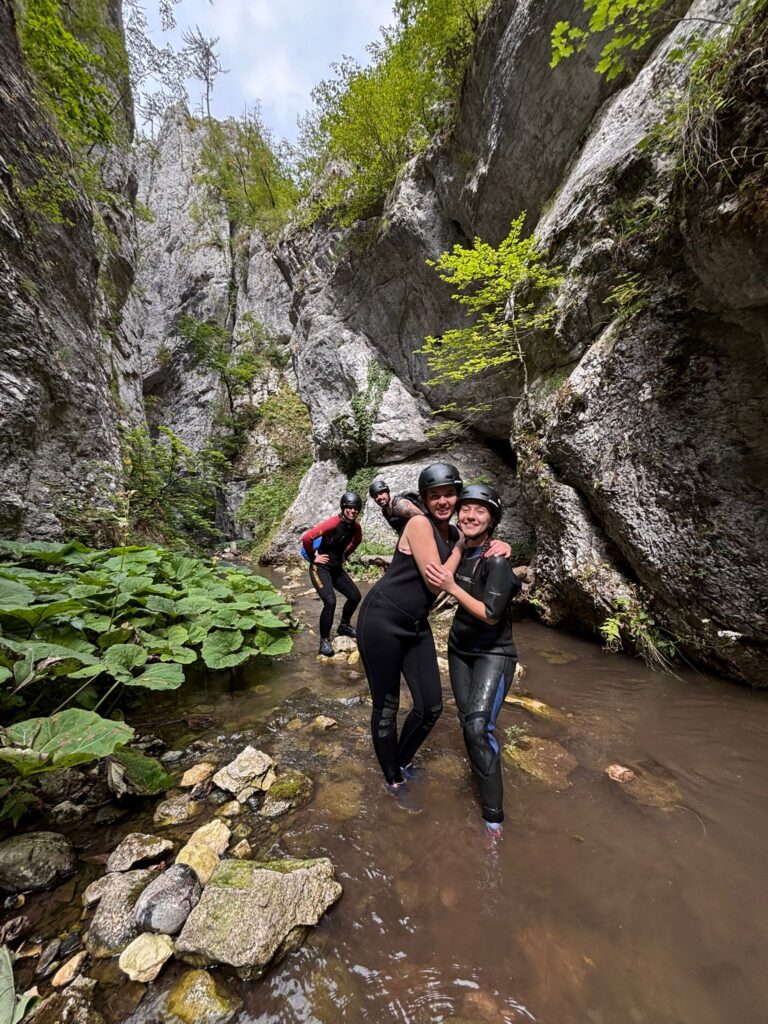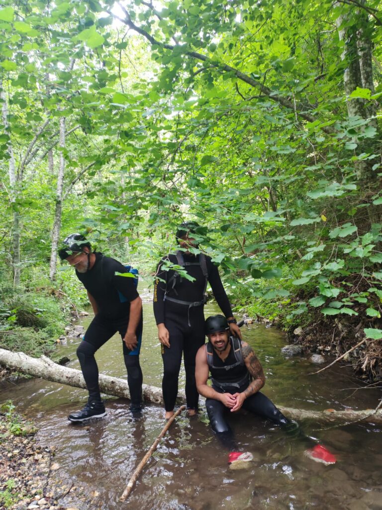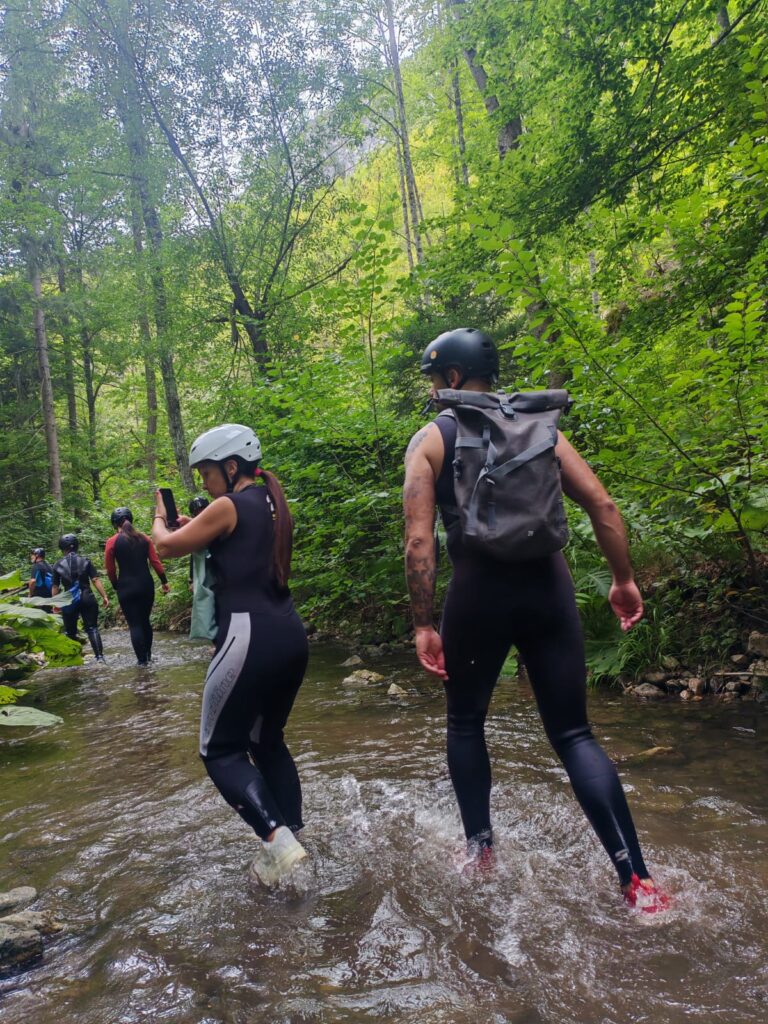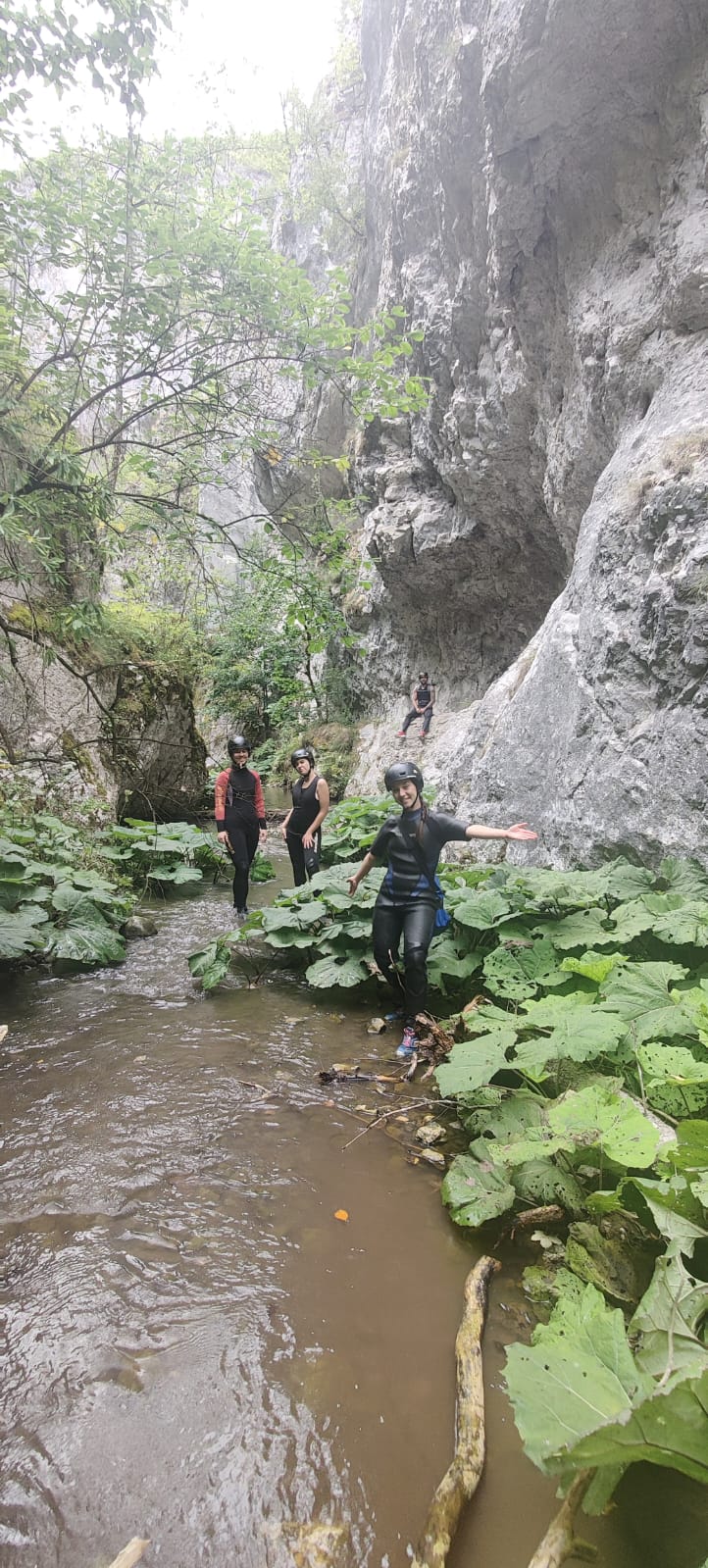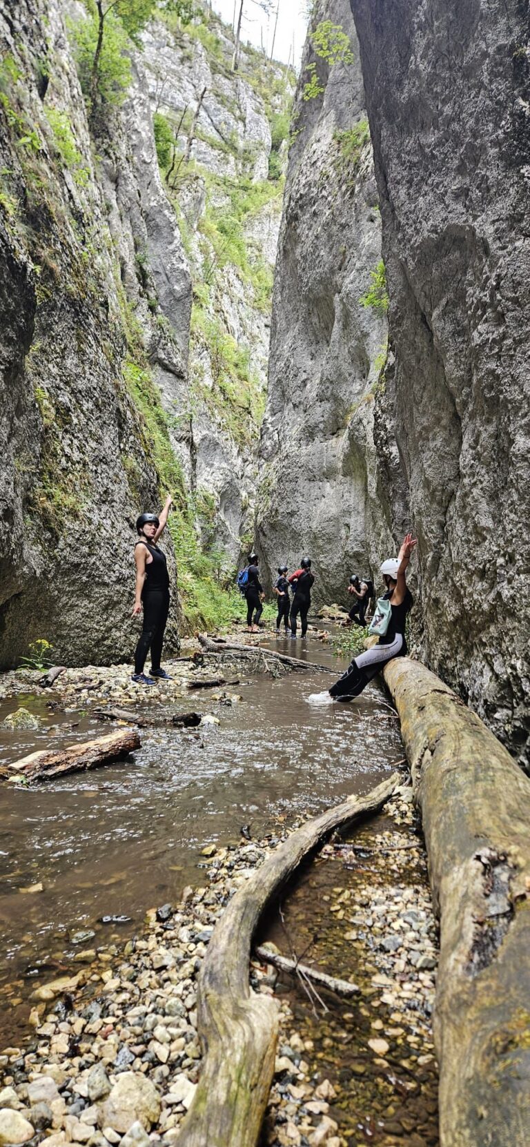Nastavljamo niz kanjon,pažljivo prelazimo preko oborenih stabala, skačemo sa stene u krečnjački bazen udubljen u koritu kanjona. Na nekoliko mesta potrebno je preplivati duboku vodu sa svom opremom koju nosimo, a pre samog izlaska iz kanjona, na proširenom delu, odmaramo se na ugrejanim stenama obasjanim podnevnim Suncem i posle okrepljenja nastavljamo do izlaska iz kanjona.
