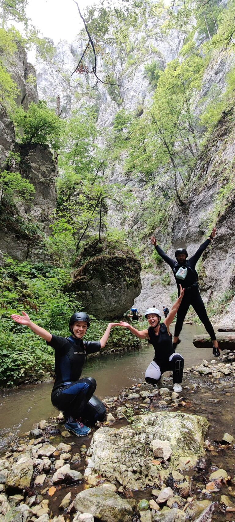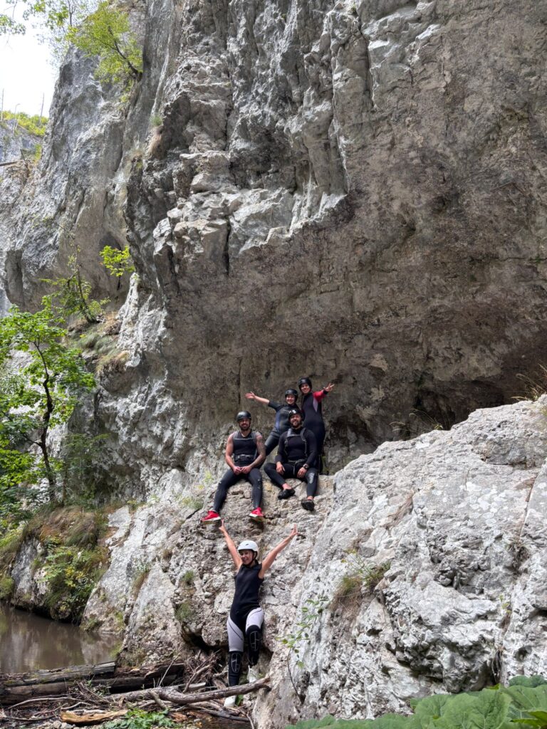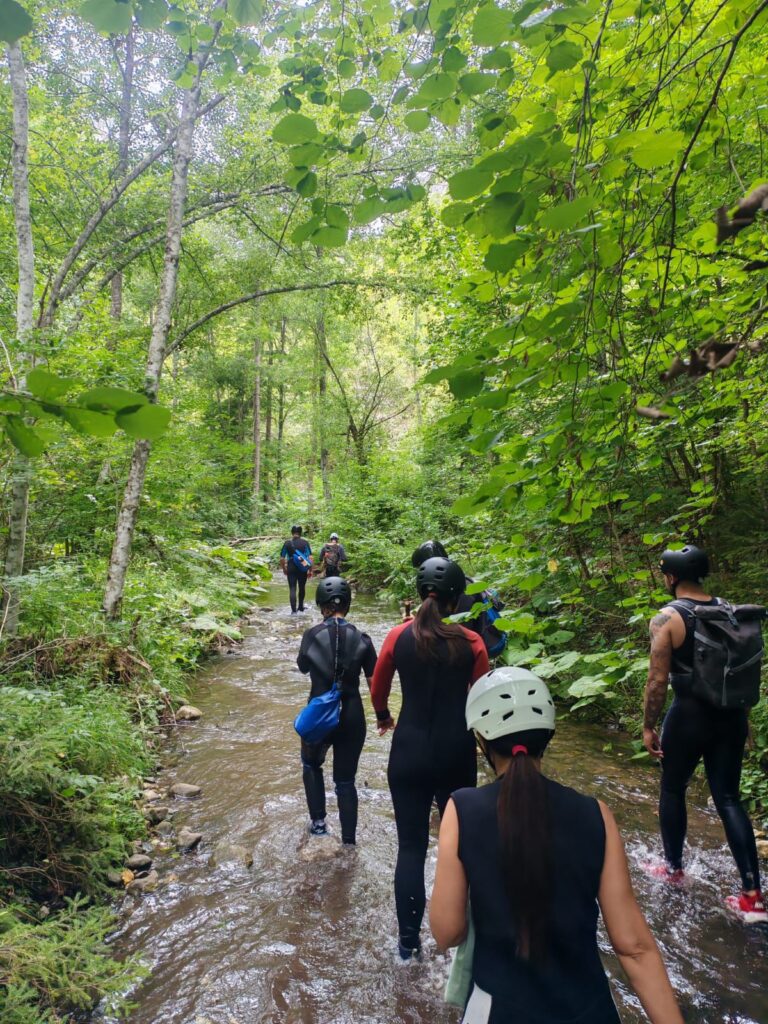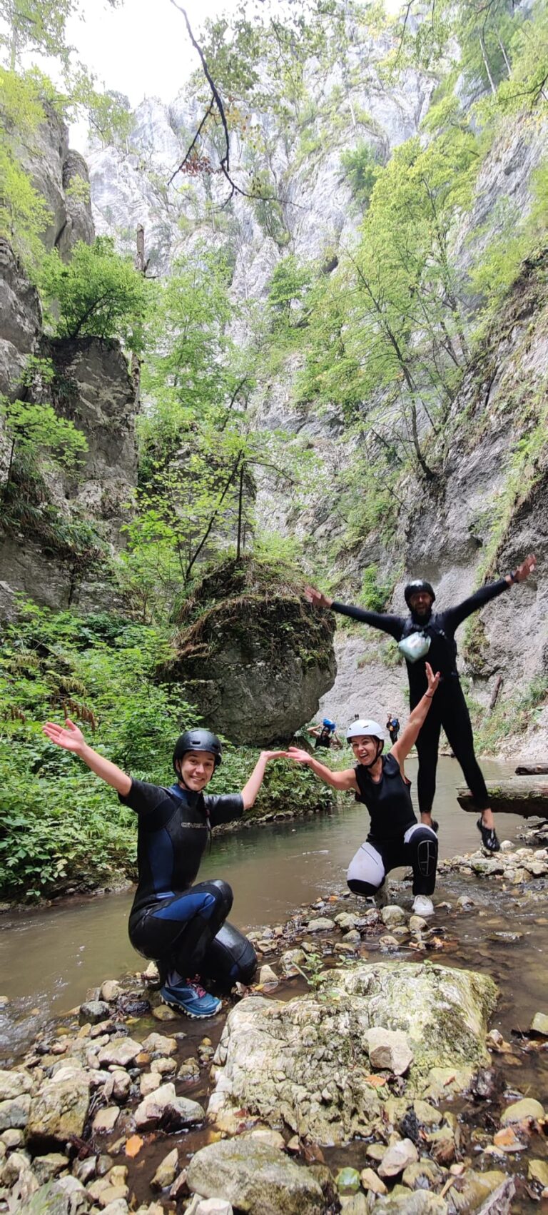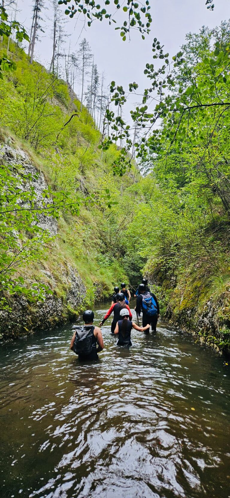 Nastavljamo niz kanjon,pažljivo prelazimo preko oborenih stabala, skačemo sa stene u krečnjački bazen udubljen u koritu kanjona. Na nekoliko mesta potrebno je preplivati duboku vodu sa svom opremom koju nosimo, a pre samog izlaska iz kanjona, na proširenom delu, odmaramo se na ugrejanim stenama obasjanim podnevnim Suncem i posle okrepljenja nastavljamo do izlaska iz kanjona.