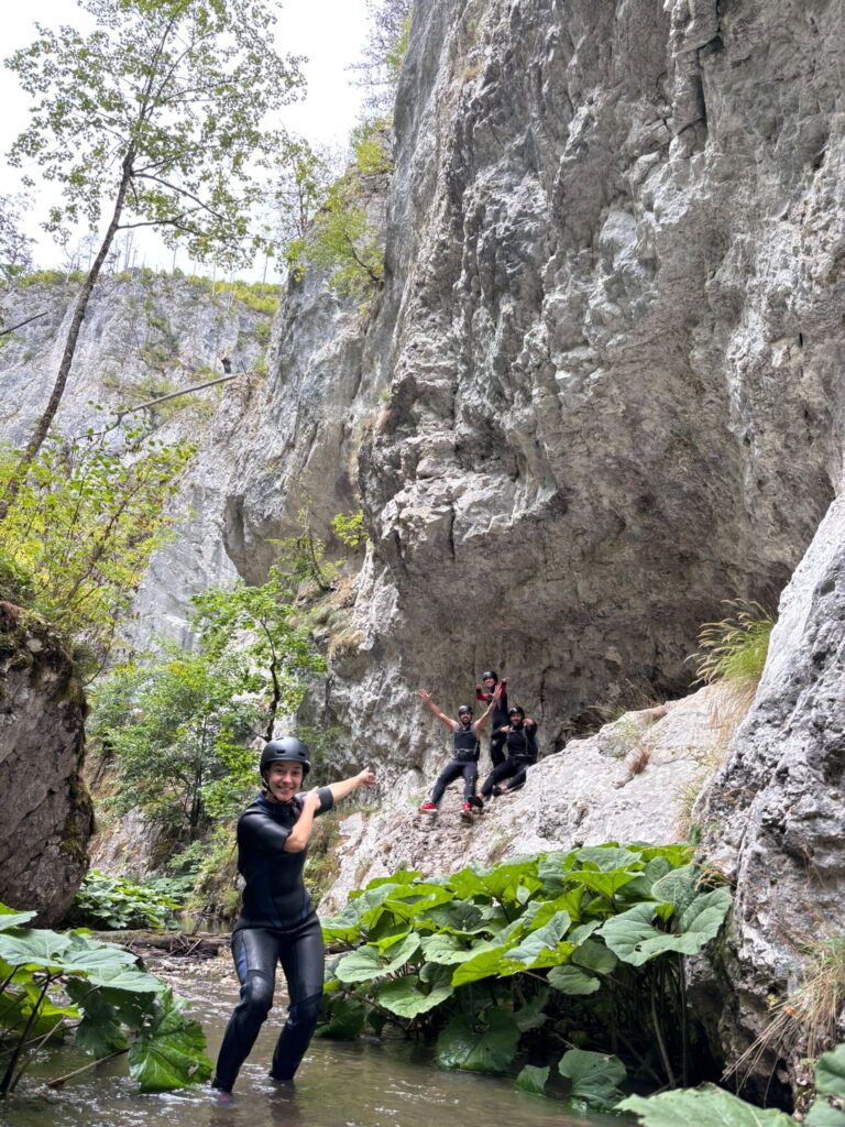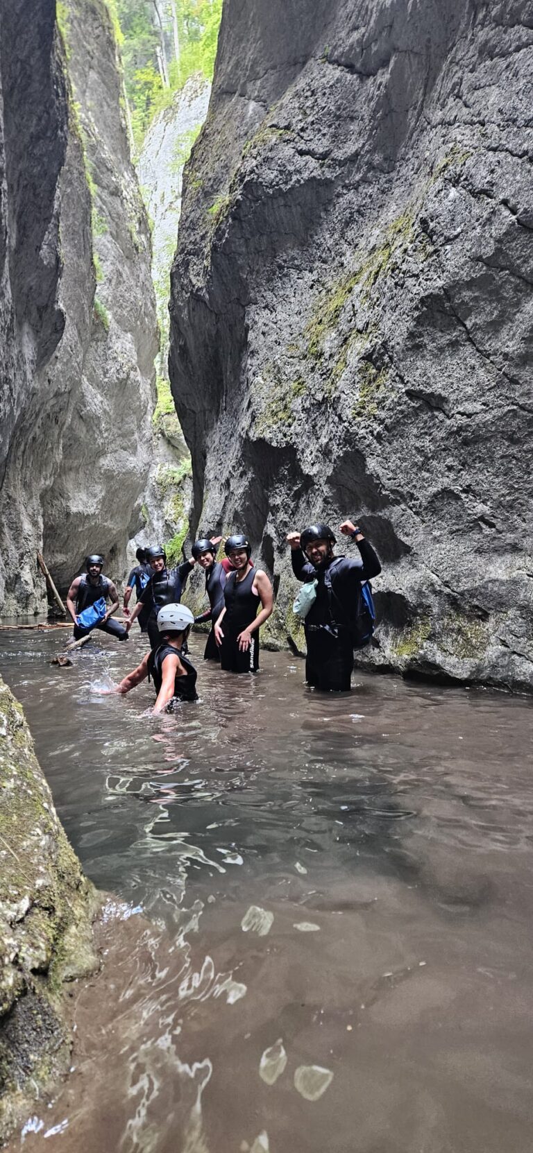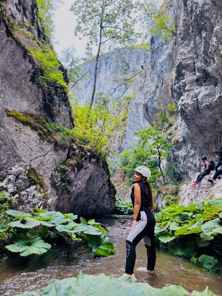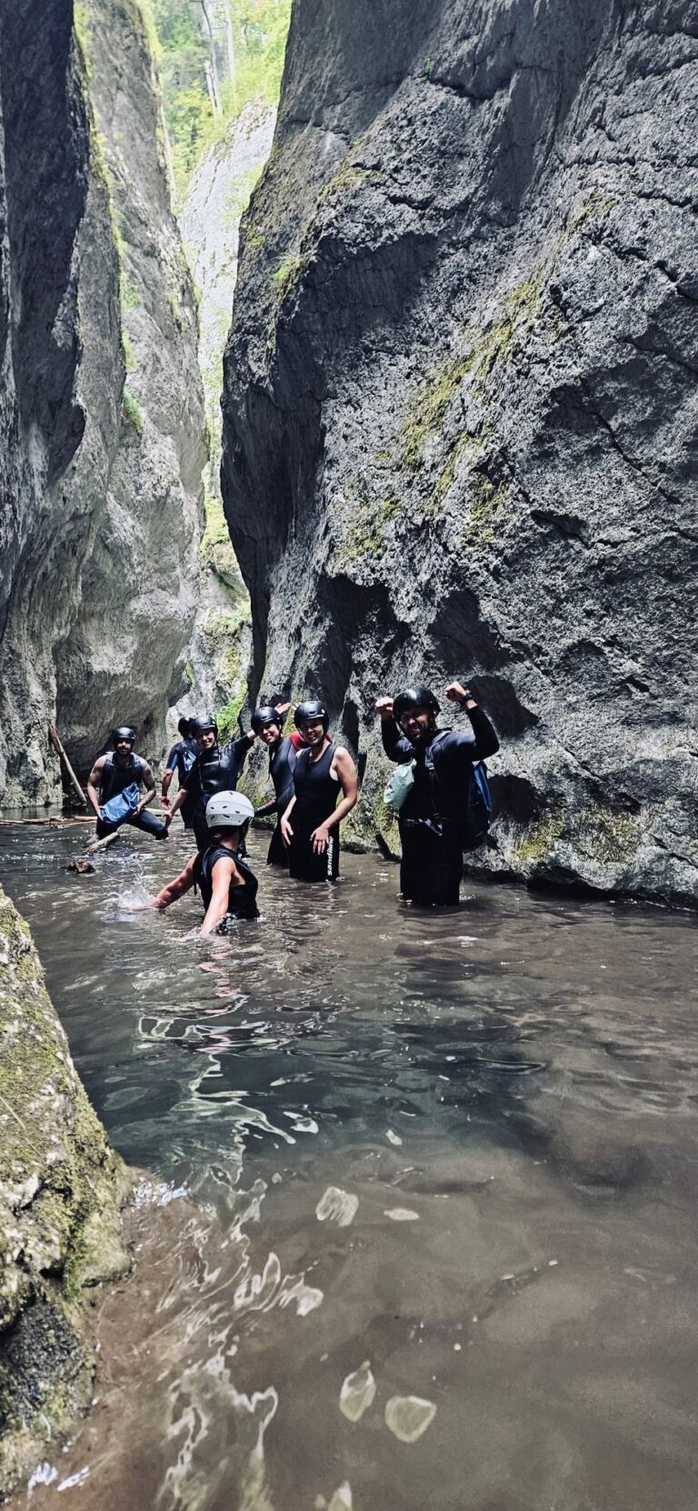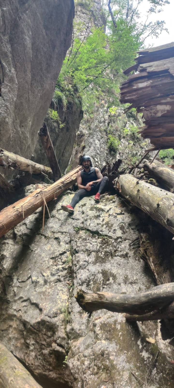 Nastavljamo niz kanjon,pažljivo prelazimo preko oborenih stabala, skačemo sa stene u krečnjački bazen udubljen u koritu kanjona. Na nekoliko mesta potrebno je preplivati duboku vodu sa svom opremom koju nosimo, a pre samog izlaska iz kanjona, na proširenom delu, odmaramo se na ugrejanim stenama obasjanim podnevnim Suncem i posle okrepljenja nastavljamo do izlaska iz kanjona.
